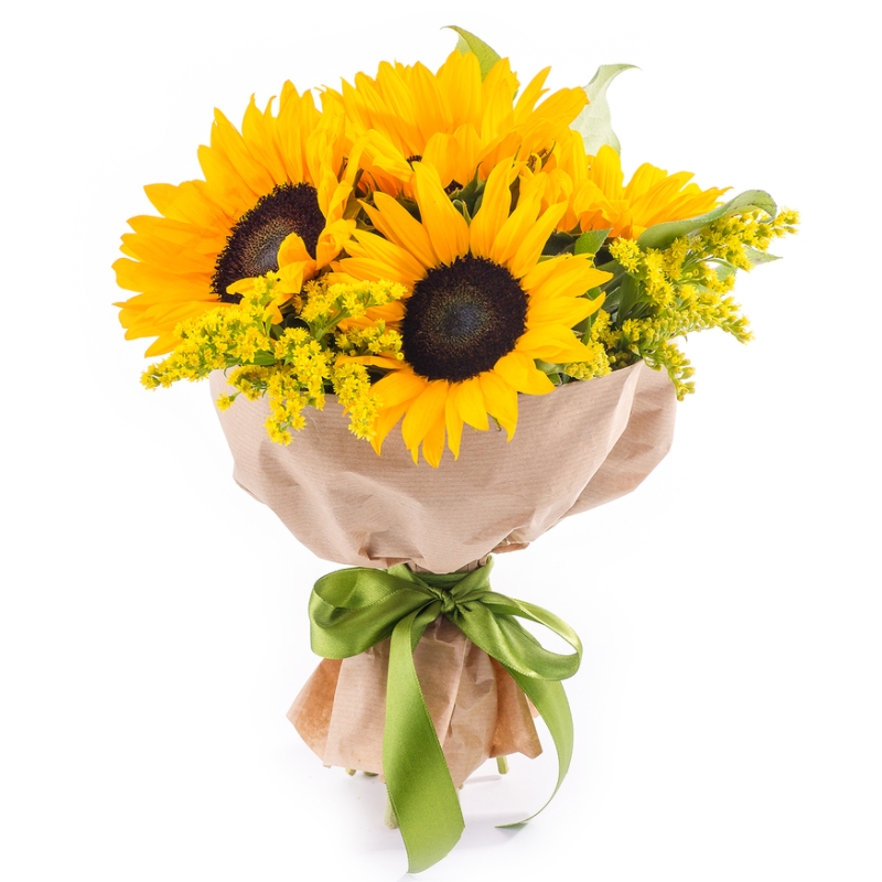 Букет состоит из 5 подсолнухов, 3 солидаго, салал, крафт, атласная лента.
