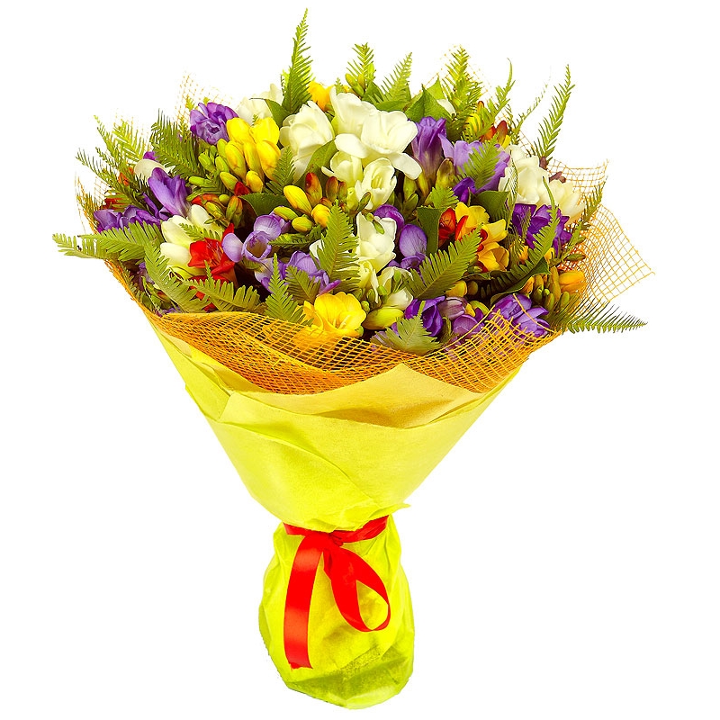 Букет состоит из 35 фрезий, зелень, сетка, фетр, атласная лента.