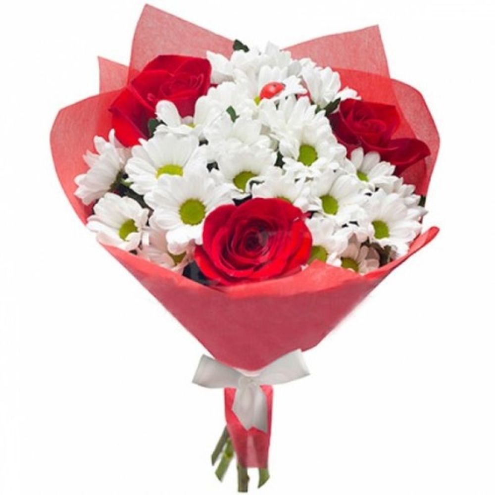 Букет состоит из 3 красные розы, 3 ветки белой хризантемы, красивая упаковка, атласная лента.