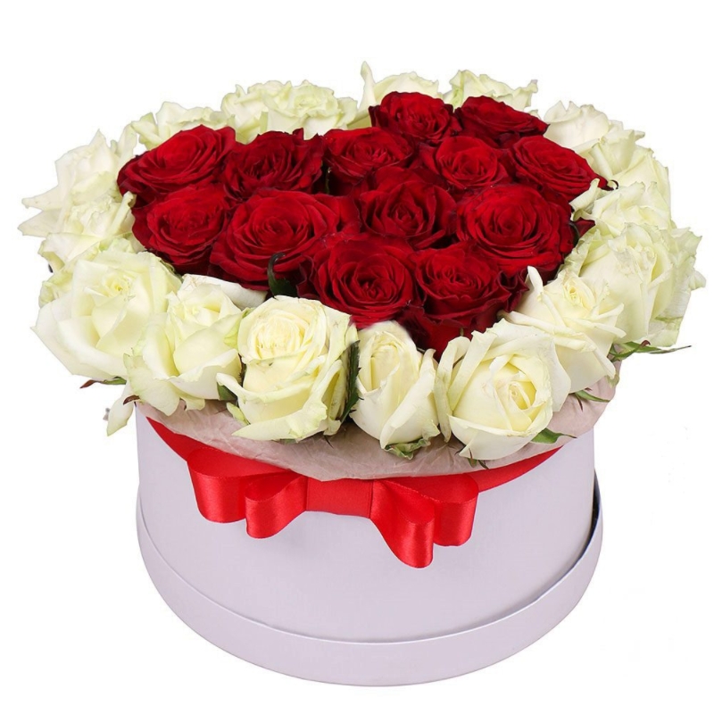 Сердце из 31 красной и белой розы в коробке